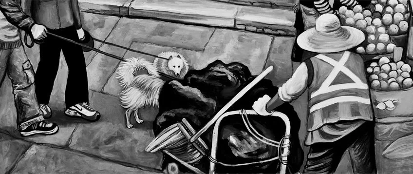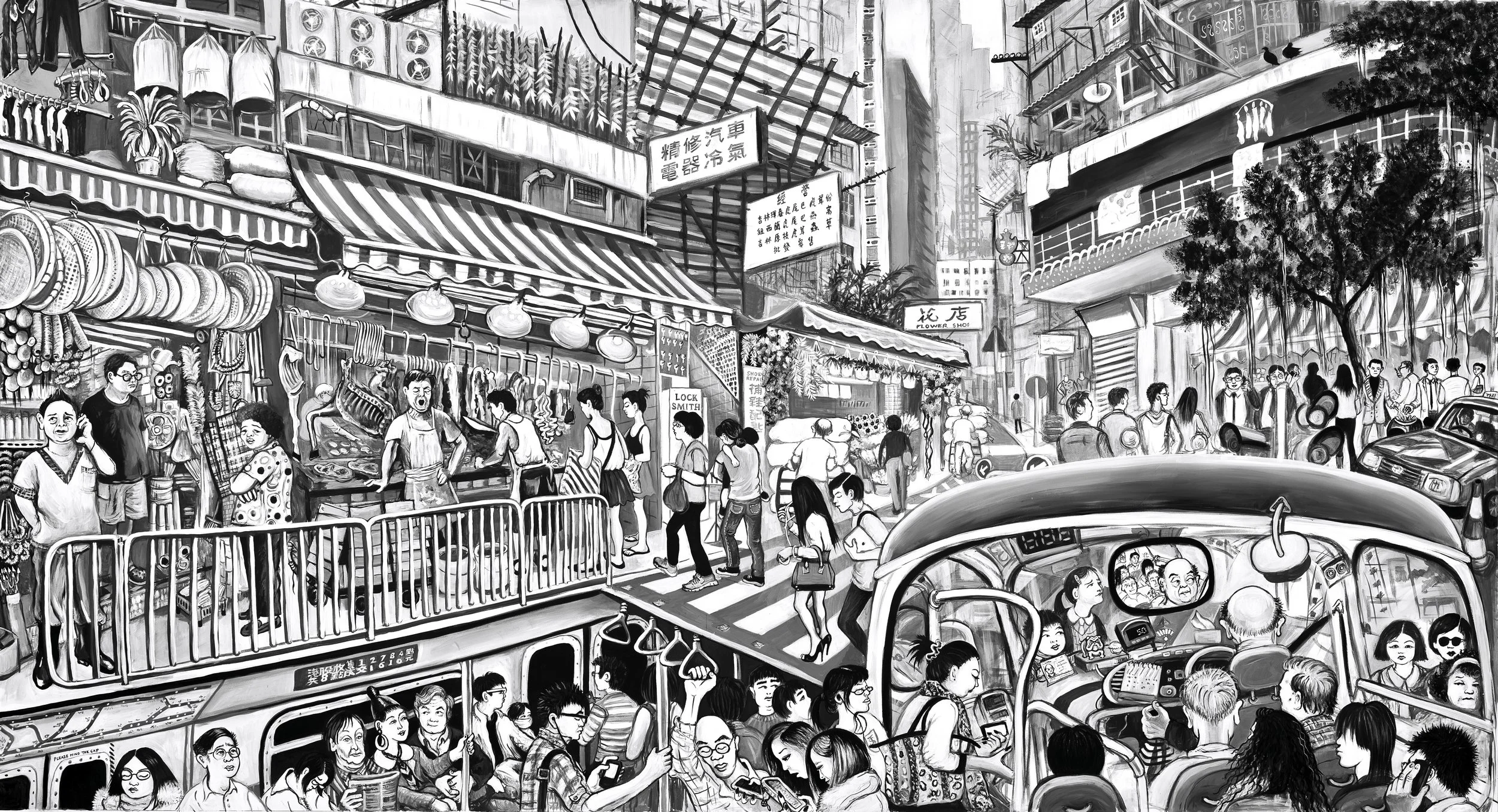 Acrylic on canvas, study for stickers at MTR station, detail of middle section showing people using public transport and street scenes