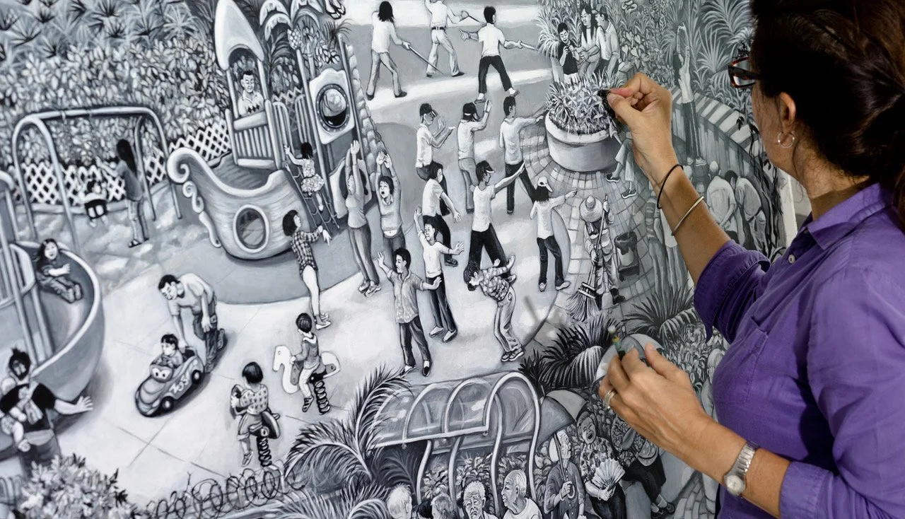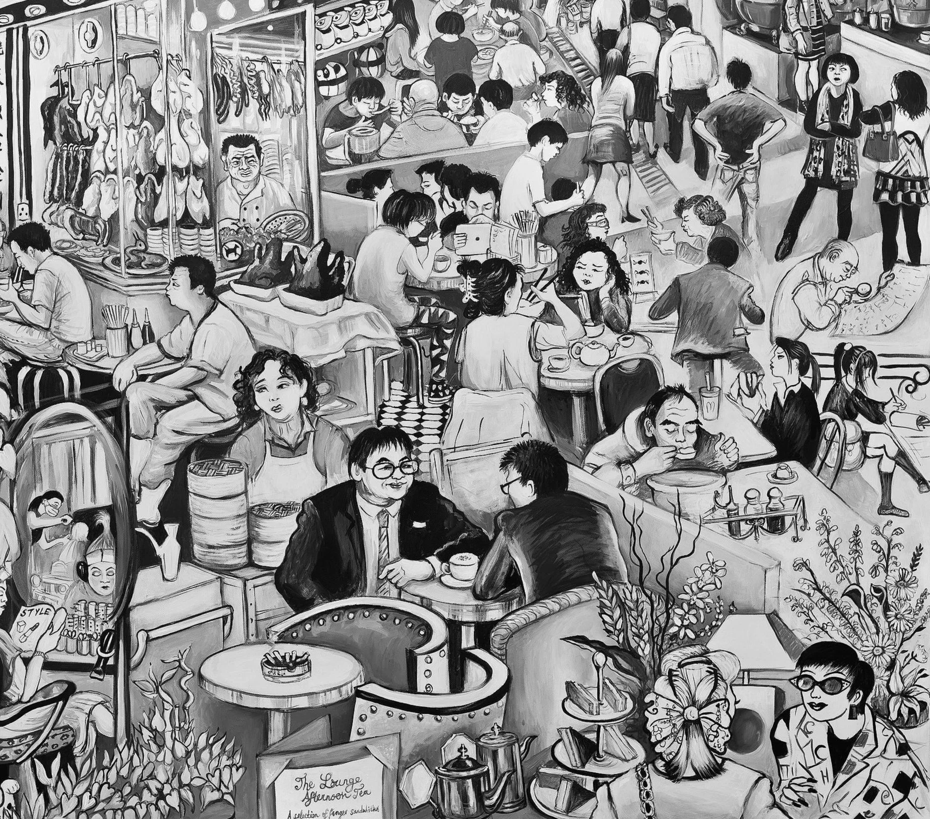 Detail section.. People eating, noodles, dim sum and having a meeting with cappuccino. Note the schoolgirl doing her homework and an older gentleman using a magnifying glass to read his newspaper. Acrylic on canvas, study for scaling up see next image..