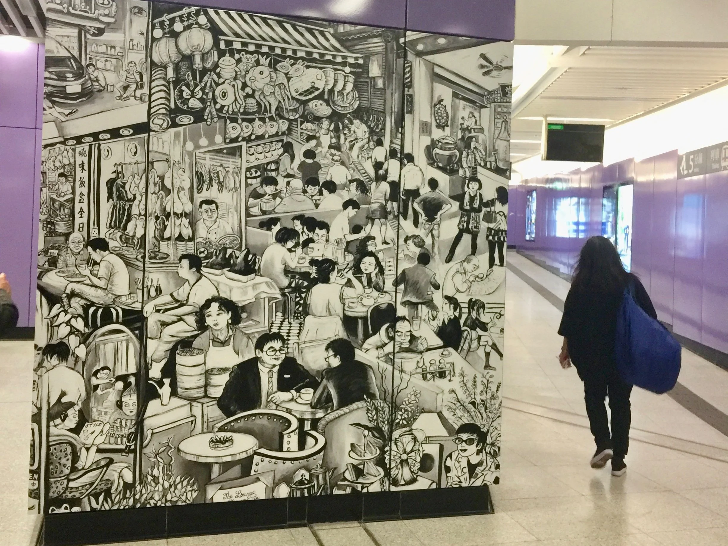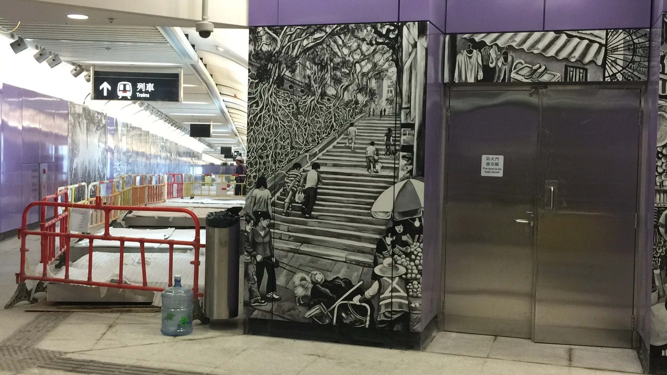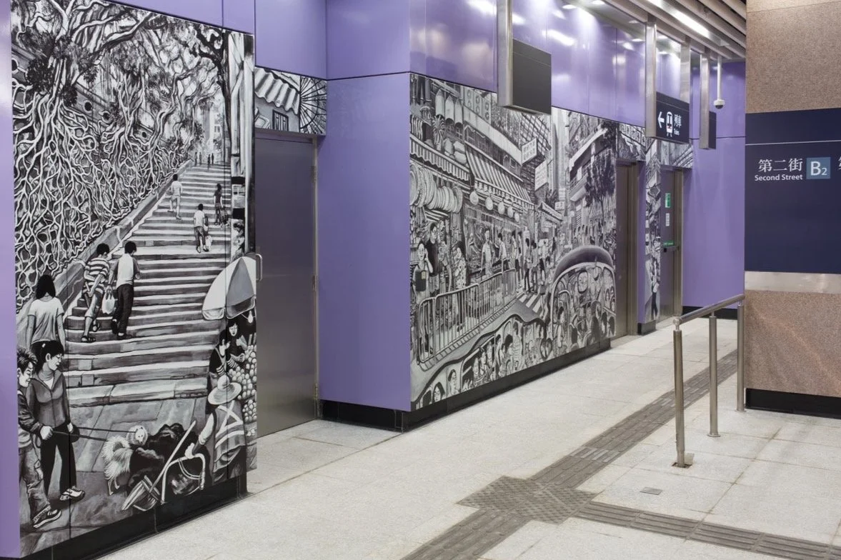 Vinyl stickers on VE [Vitreous Enamel] panels, in situ at Sai Ying Pun MTR station by the lifts at exit B1/B2