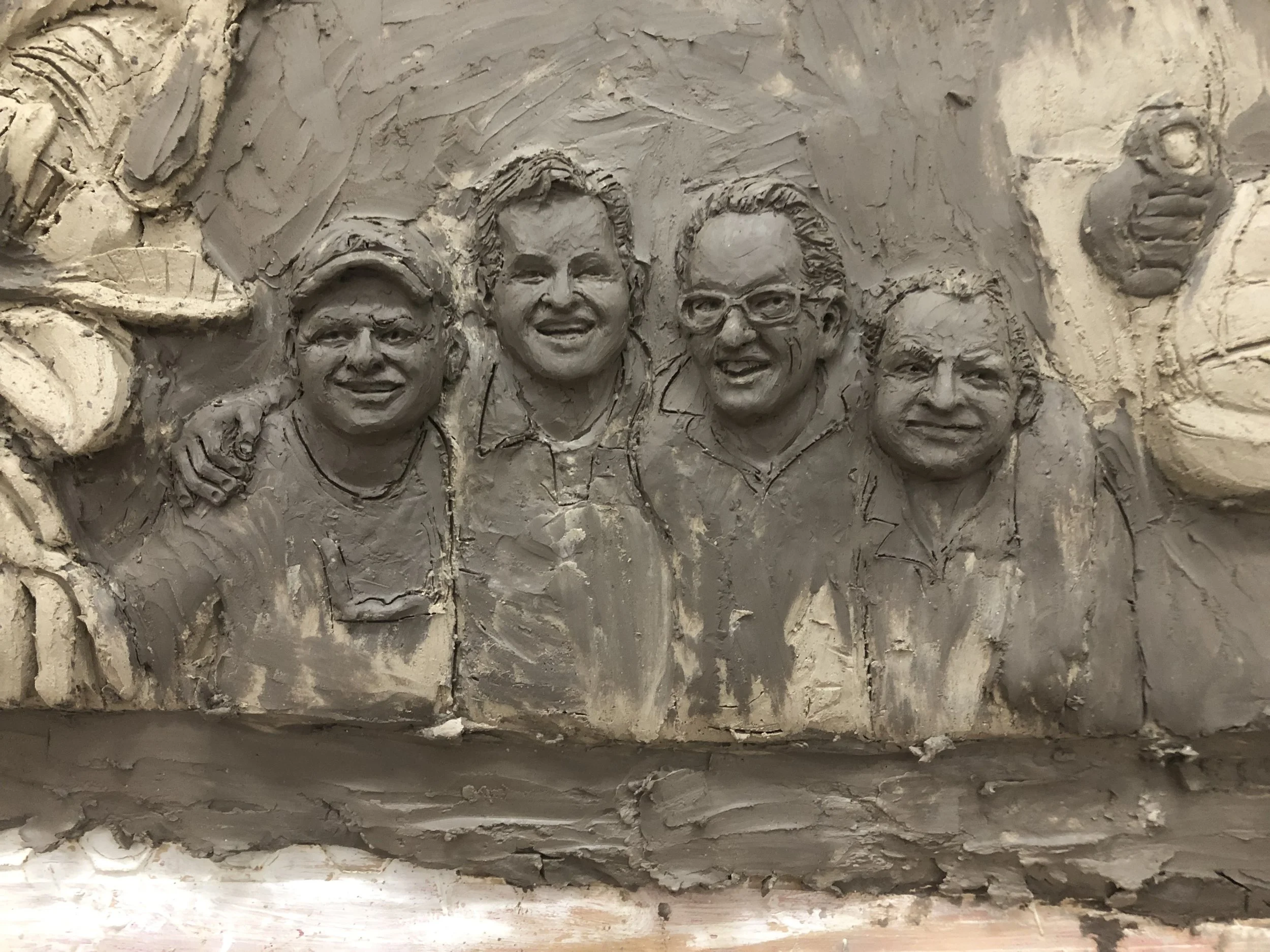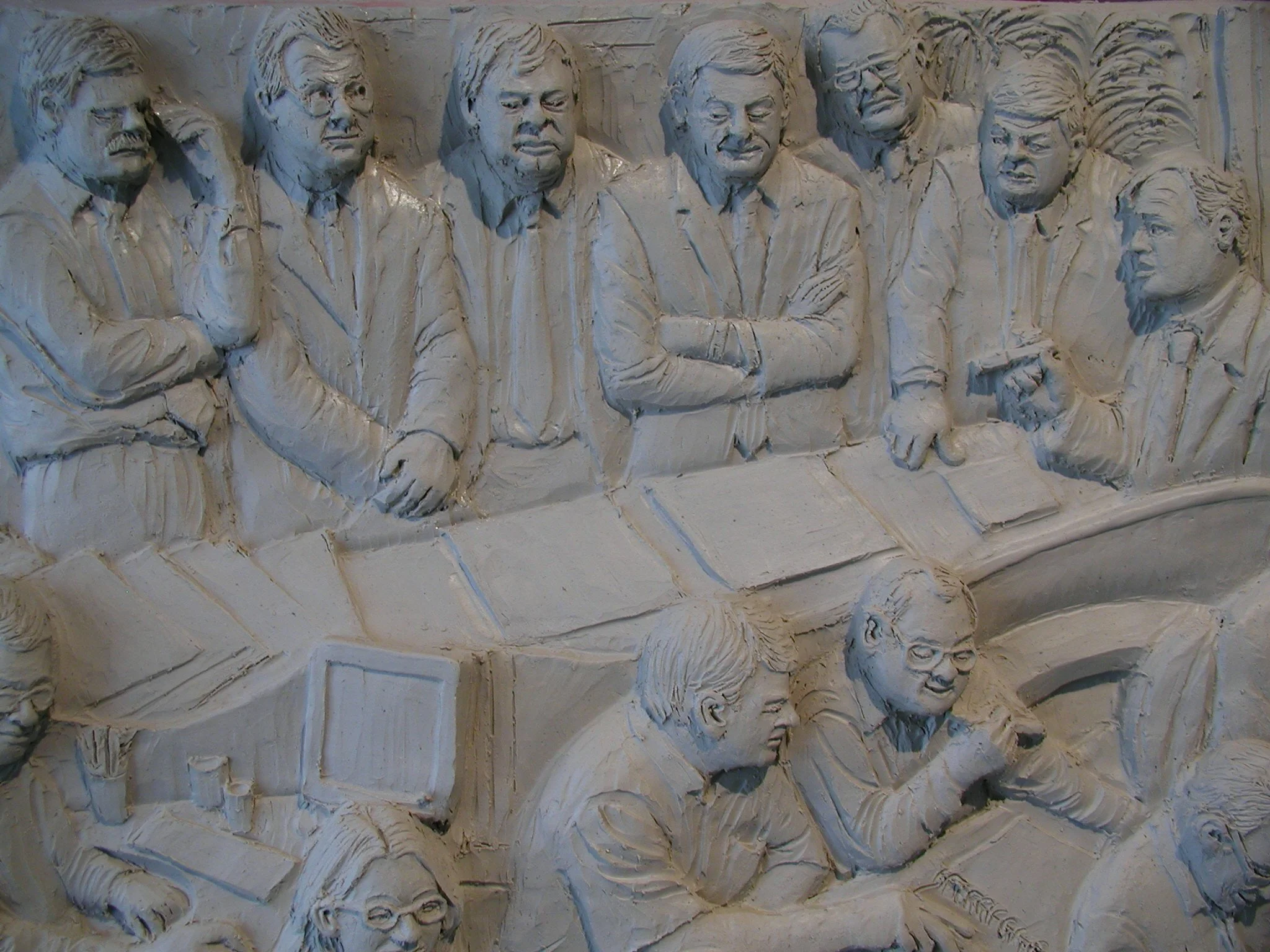 Royal Bank Of Scotland Clay detail in progress, directors in a meeting, standing looking at the architects plans for the new headquarters 2000-2001 The man with his arms crossed is Sir Fred Goodwin much talked about in the media since. Worked from photos that I took in one of the many Mace site meetings, each head about the size of a golf ball. See completed piece in Construction commissions section of this website