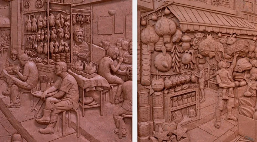 Detail of two clay panels for Sai Ying Pun MTR station, (left) noodle shop, (right) lantern shop