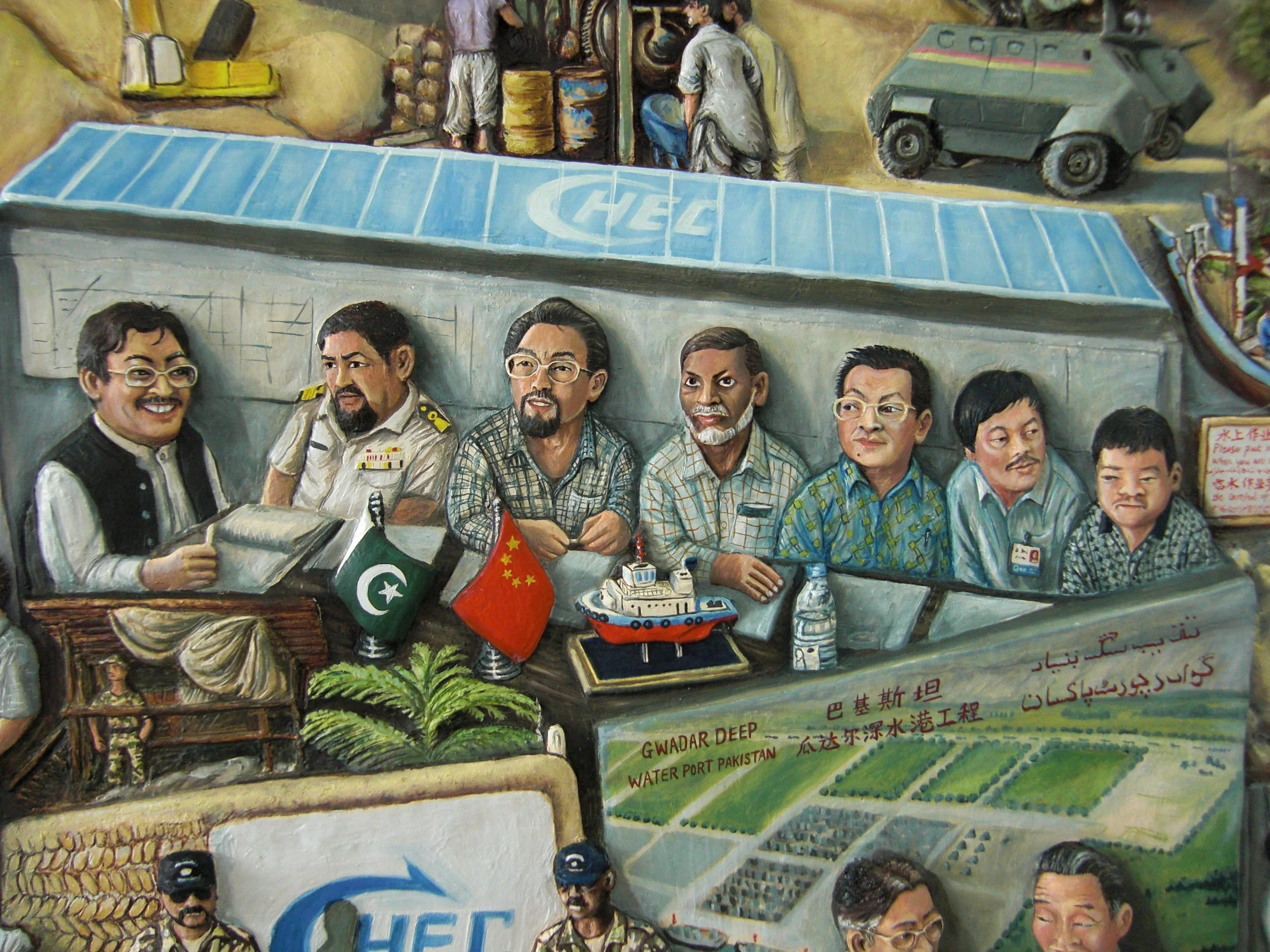 Gwadar Deep water port. Bas-Relief 2009/10 resin painted in oils 5ft x 4ft Commissioned by a Chinese engineering company involved in the building of Chek Lap Kok Airport. They commissioned a similar relief to display alongside the CLK relief which already was in heir head office in Beijing. To commemorate the building of a deep water port in Gwadar. Unlike many of the previous construction projects I’ve had a studio based on site, this project was already complete, so together with directors who’d been based in Pakistan we spent hours going through images that summed up the feel of life on site. A giant jigsaw of images were worked up into rough sketches to create the final composition for the relief.