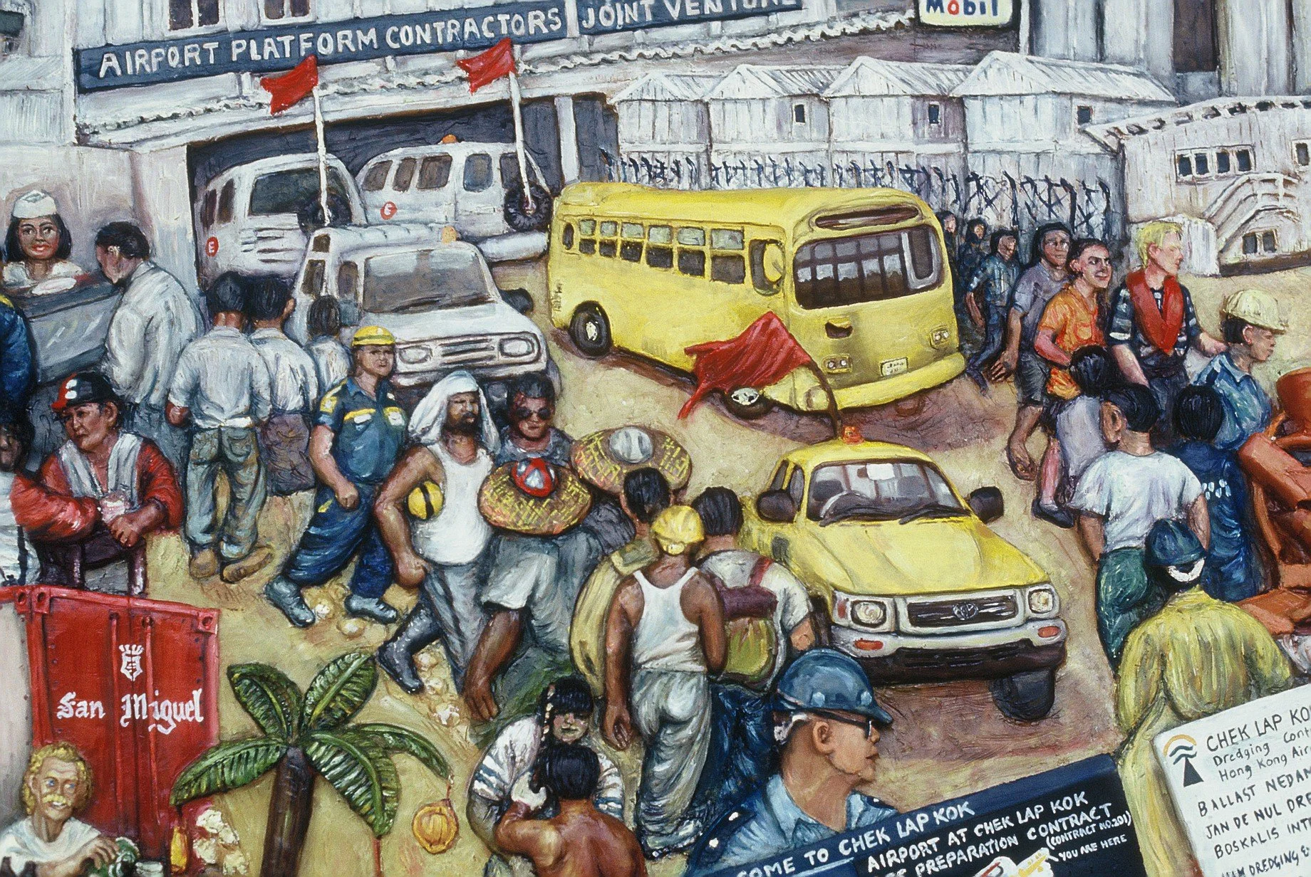 Building of Chek lap Kok Airport, HK, 1994-5 bas-relief in oils 183 x 123cms relief that records life on site during the building of Hong Kong’s Airport platform. I had a studio in one of the workers cabins & spent over a year based on site. The sand coloured map is the completed shape of the platform. Specialist Dutch Dredging ships sucked sand & mud from the seabed to build the platform (top centre). Local ferries transported people to work (right). Divers helped build the sea walls & place concrete blocks at the waters edge. Derrick lighters & dumper trucks shifted rocks (lower left). Specialist construction teams became part of a multicultural work force that thrived in Hong Kong during that period.