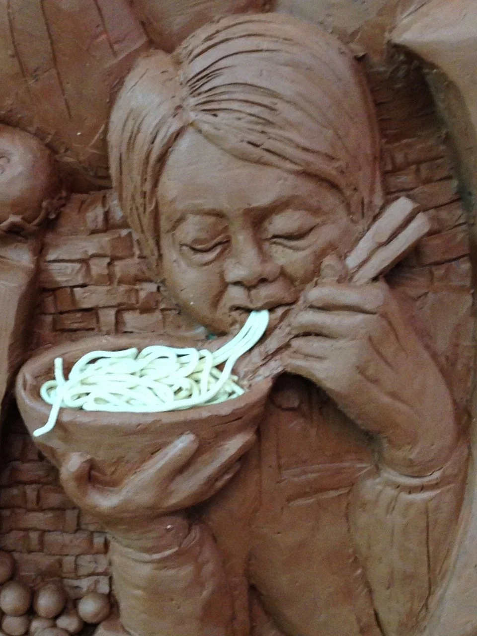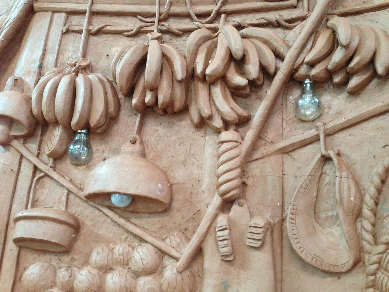Clay and actual produce was pressed into the clay just before making the silicone jacket. When the mould is removed the produce is discarded. This poor frog was in a black rubbish bin at the wet market. It had been gutted and had no shape, so had to be stuffed with soft clay. Real objects have been cast in most of the clay panels. Lego pieces, coins, ropes, walnuts, durian, lychees, incense sticks and noodles . . .