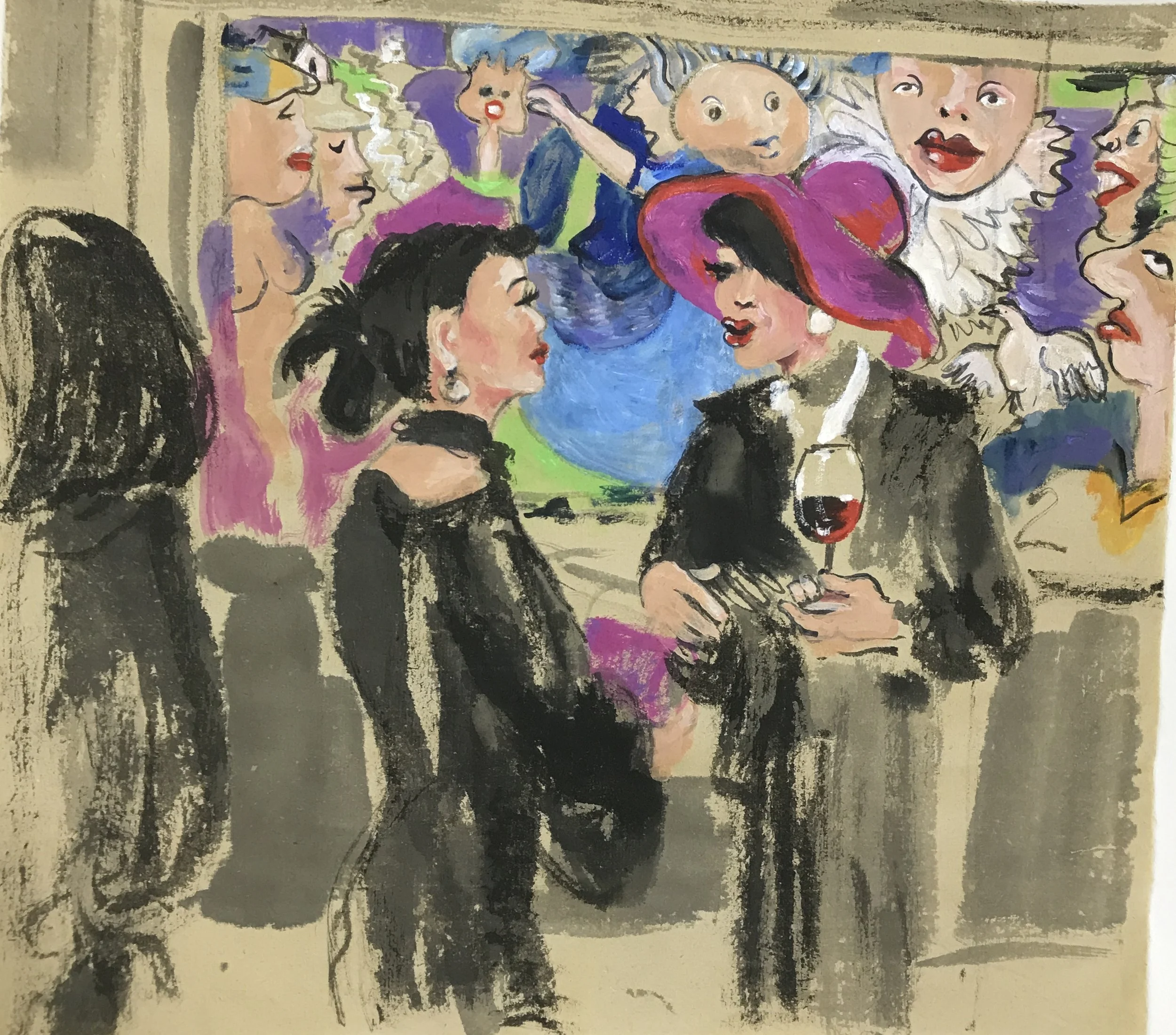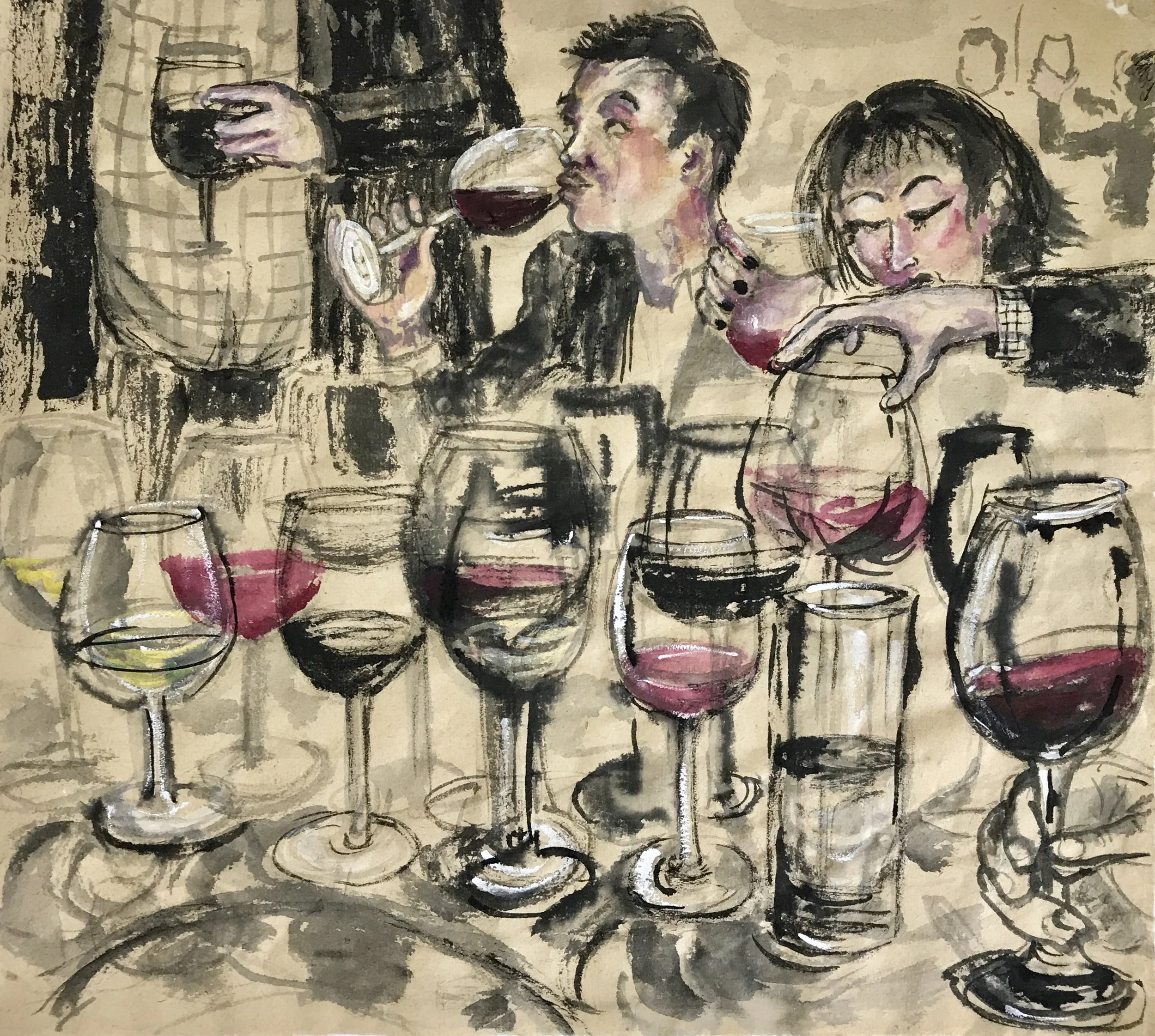 Red Wine tasting maybe Pinot, Burgandy, Bordeaux or maybe Merlot can’t remember but a great scene to animate… see animate section. Ink on rice paper 2016