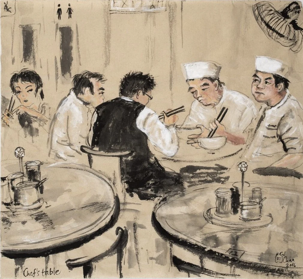 Chefs cigarette break, Chinese inks on rice paper. 2016 This is in Soho House Collection (HK) in the blue room