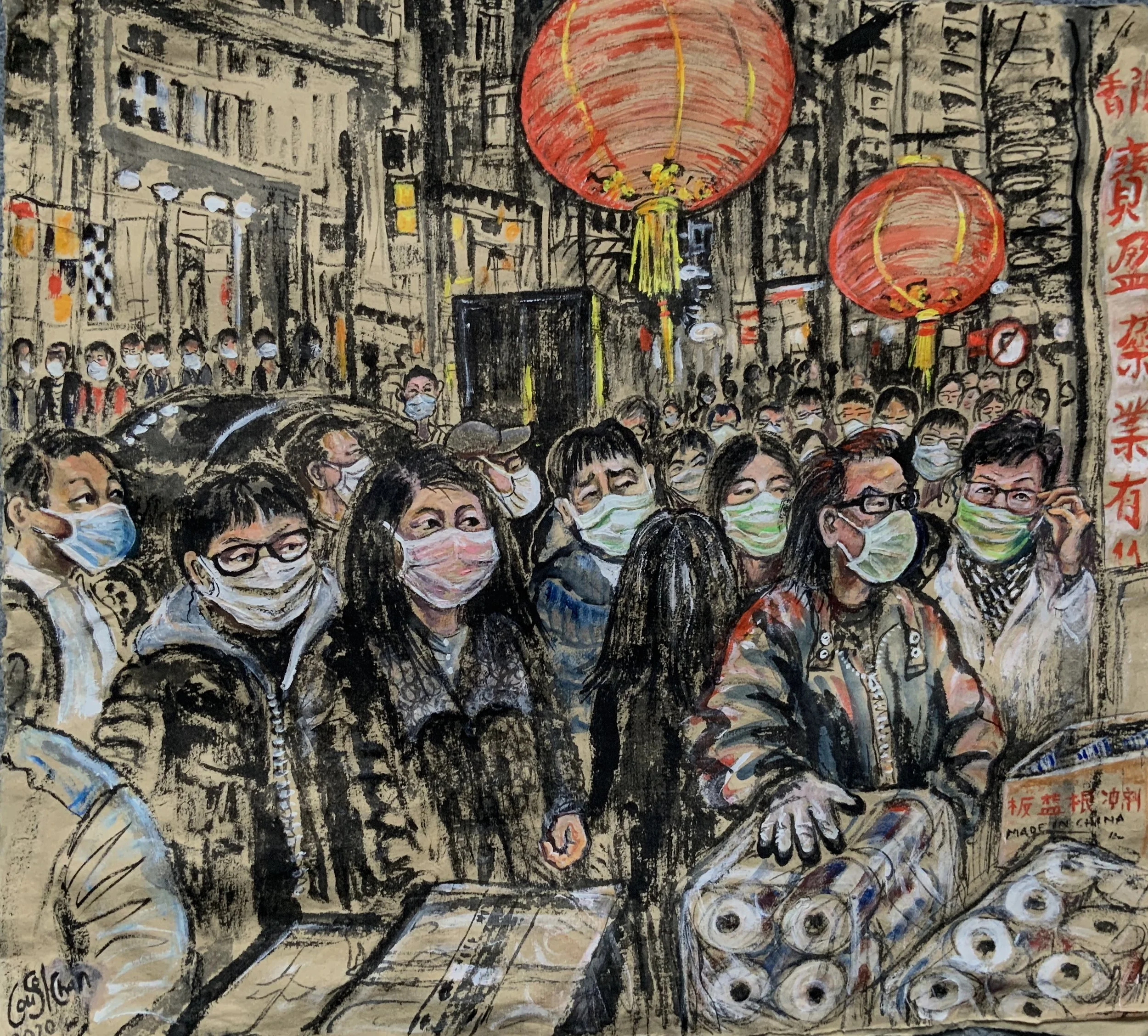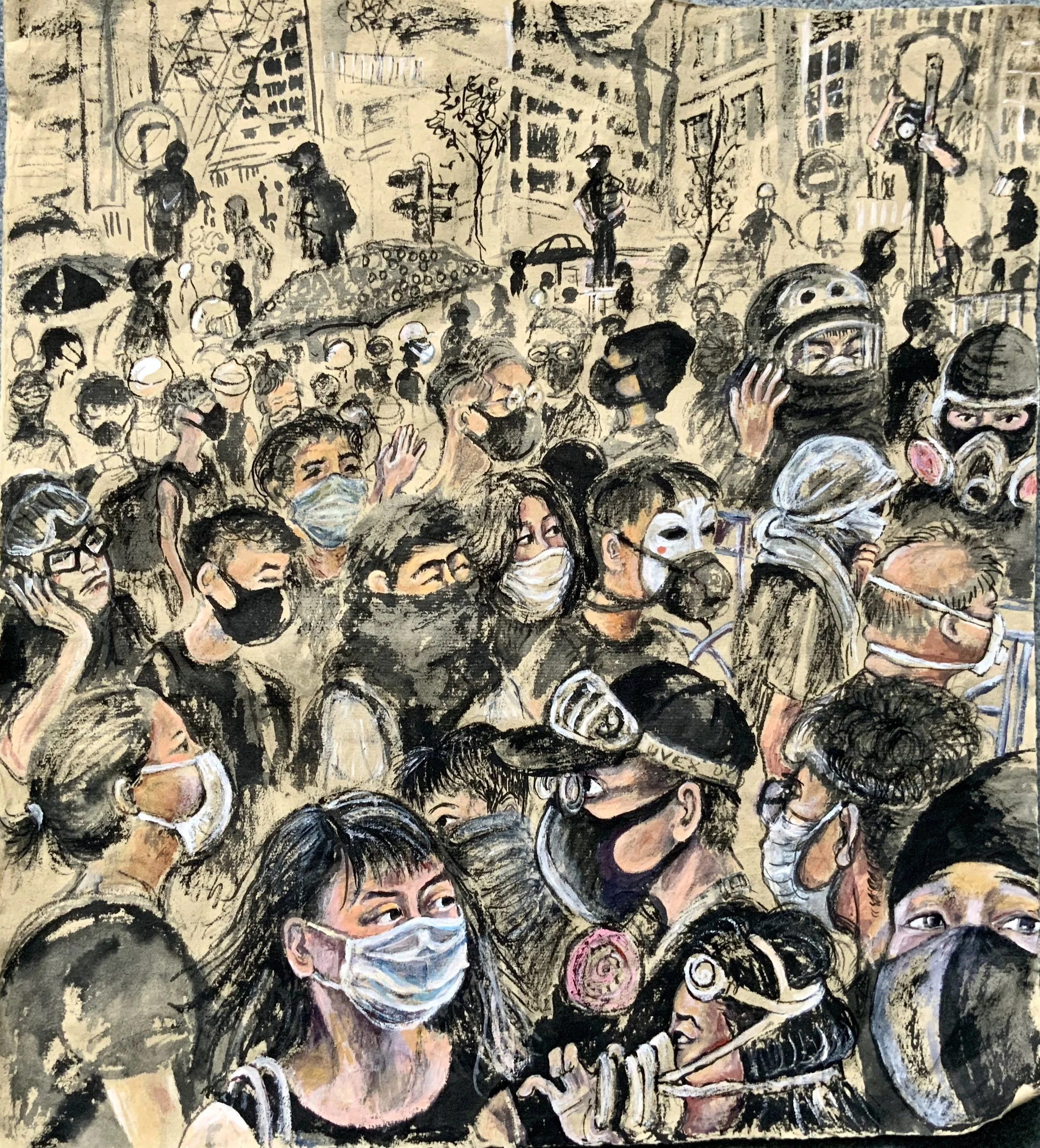 Protests, Wanchai 2019, in the heart of the demonstrations. I spent some time photographing and drawing at the protests. Masks then worn for protection against tear gas which seems now a strange precursor to masked faces everywhere the following year of the pandemic.