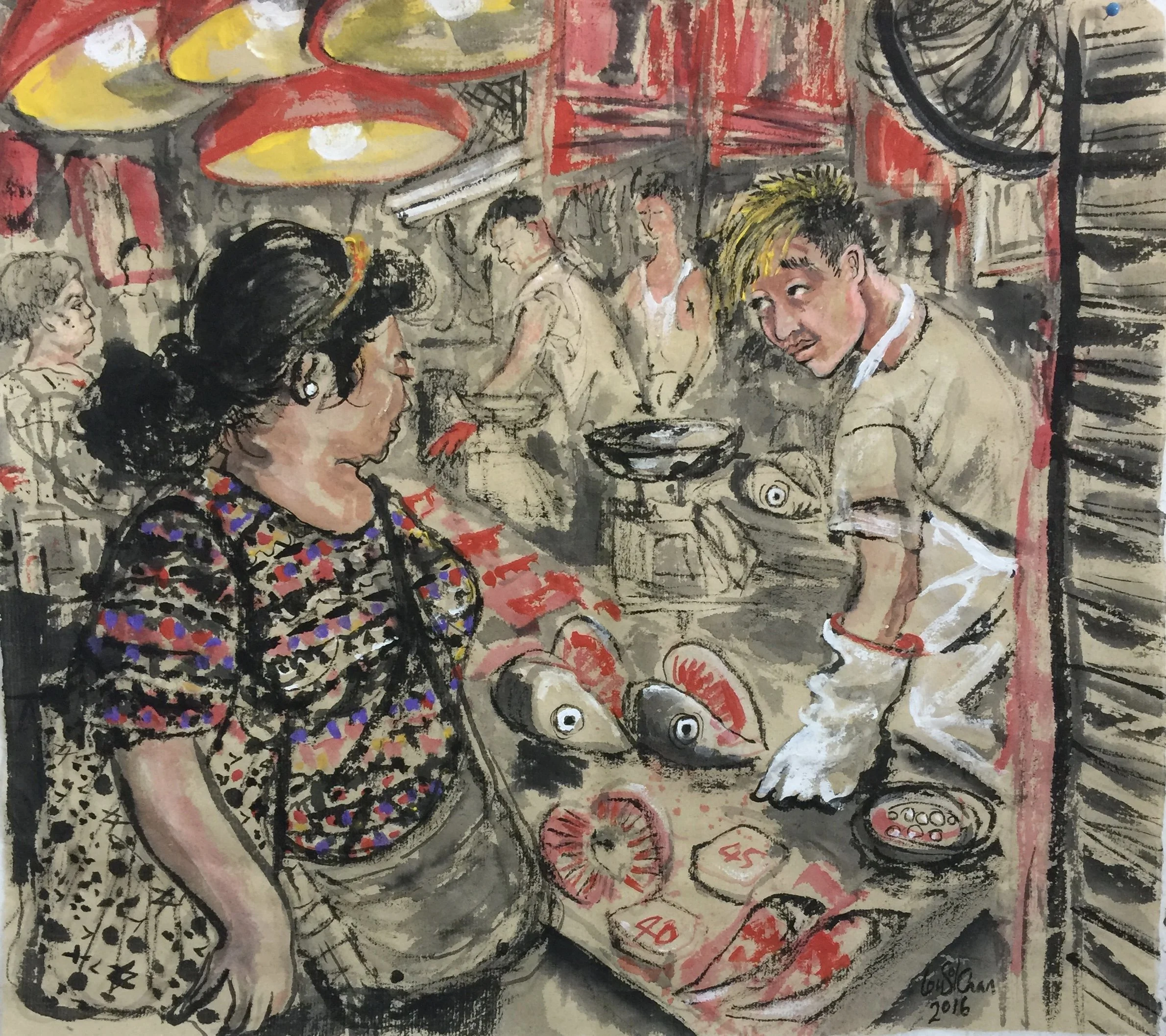 Fish Market, some of the organs were still pumping blood, this woman was choosing fish heads maybe for fish head soup.. or my favourite fish lip soup (joking, but do love the name) 2017 Chinese inks and acrylics on rice paper