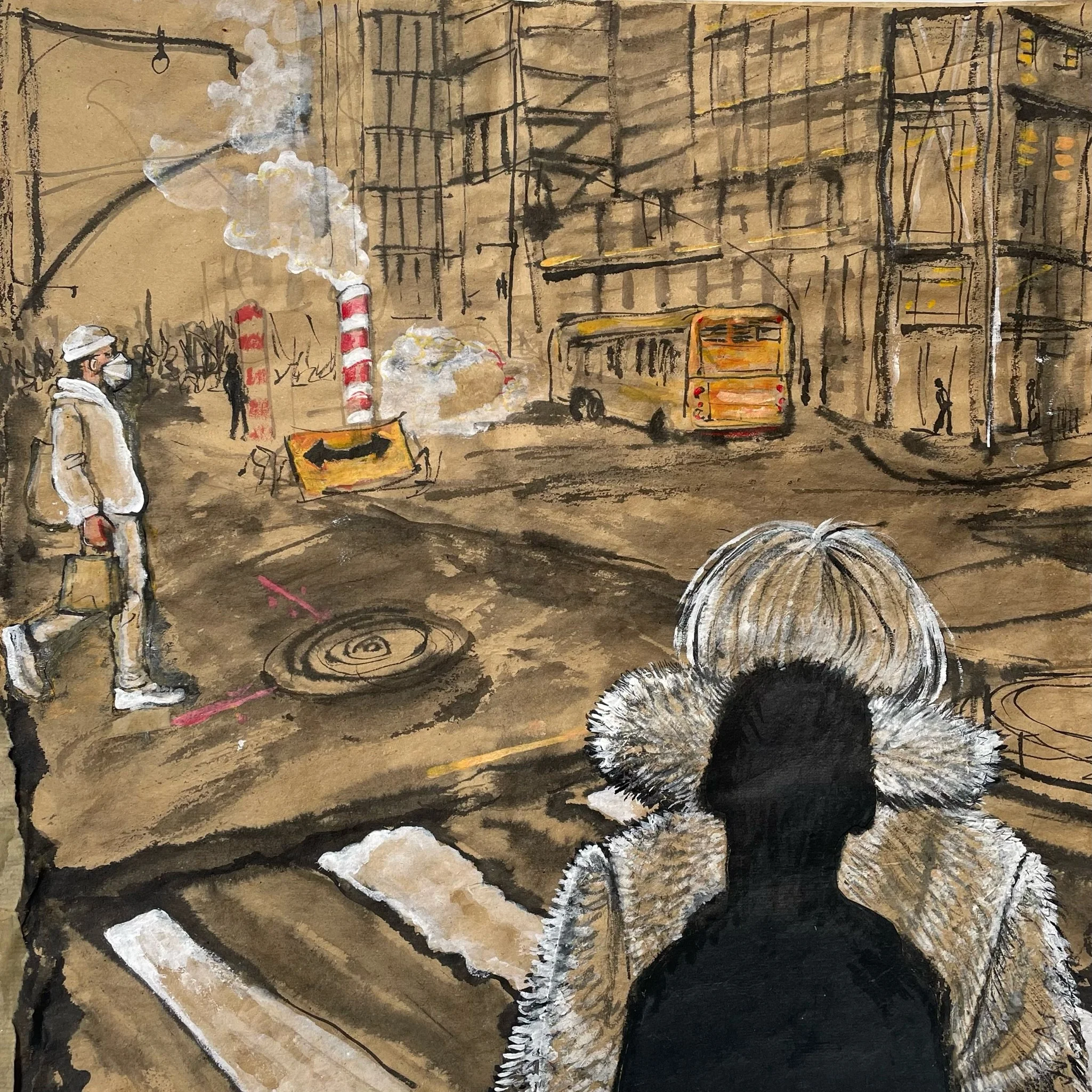 W57th & 8th street scene inspired by photograper Lee Friedlander. Chinese ink & acrylic on rice paper 42x46cms