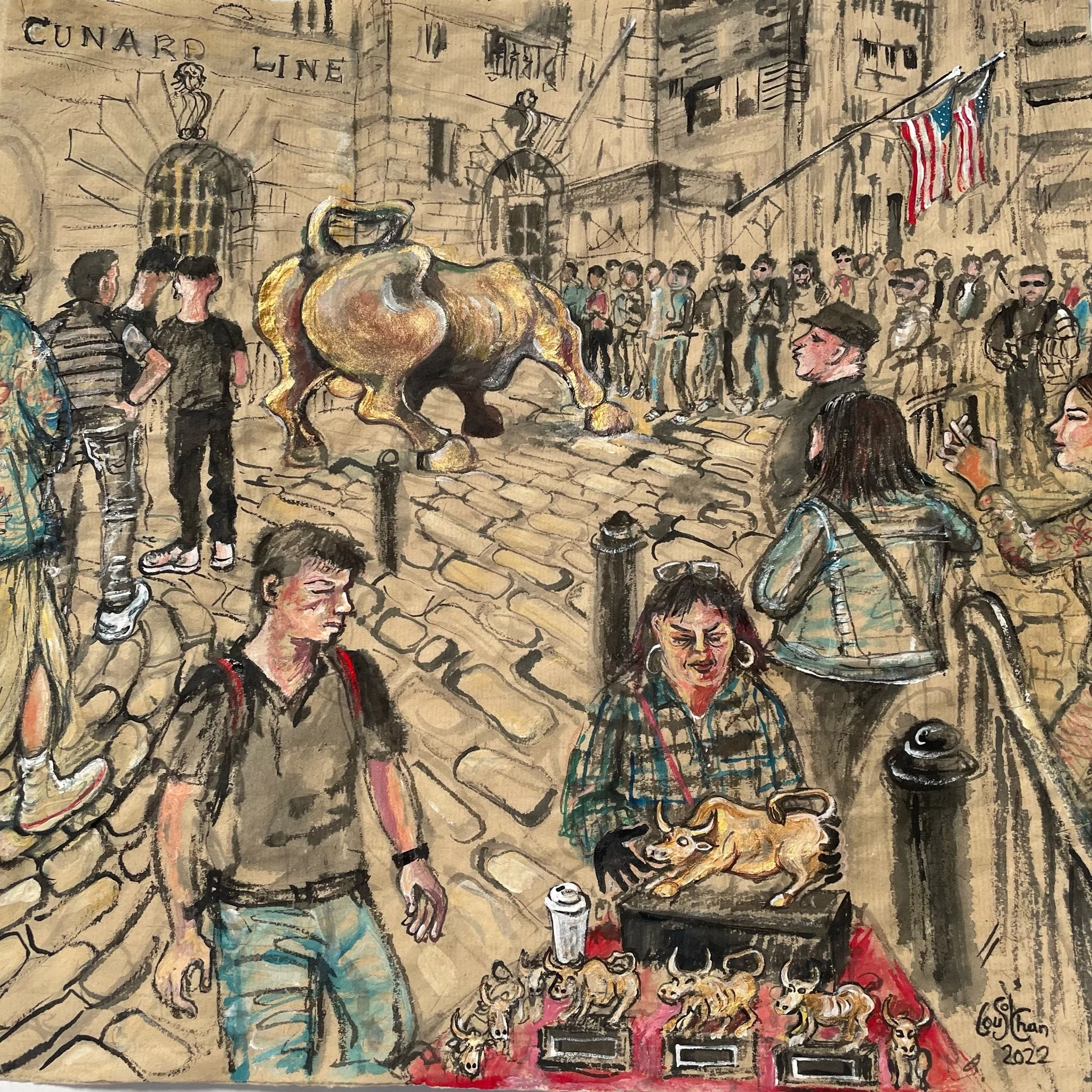 Charging Bull of Wall Street Manhattan 2022 with vendor selling mini golden Bulls. Chinese inks & acrylic on bamboo grass paper. 42x46cms